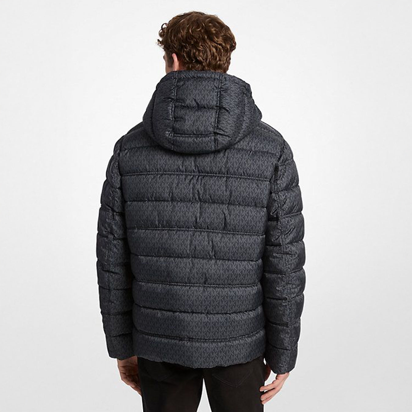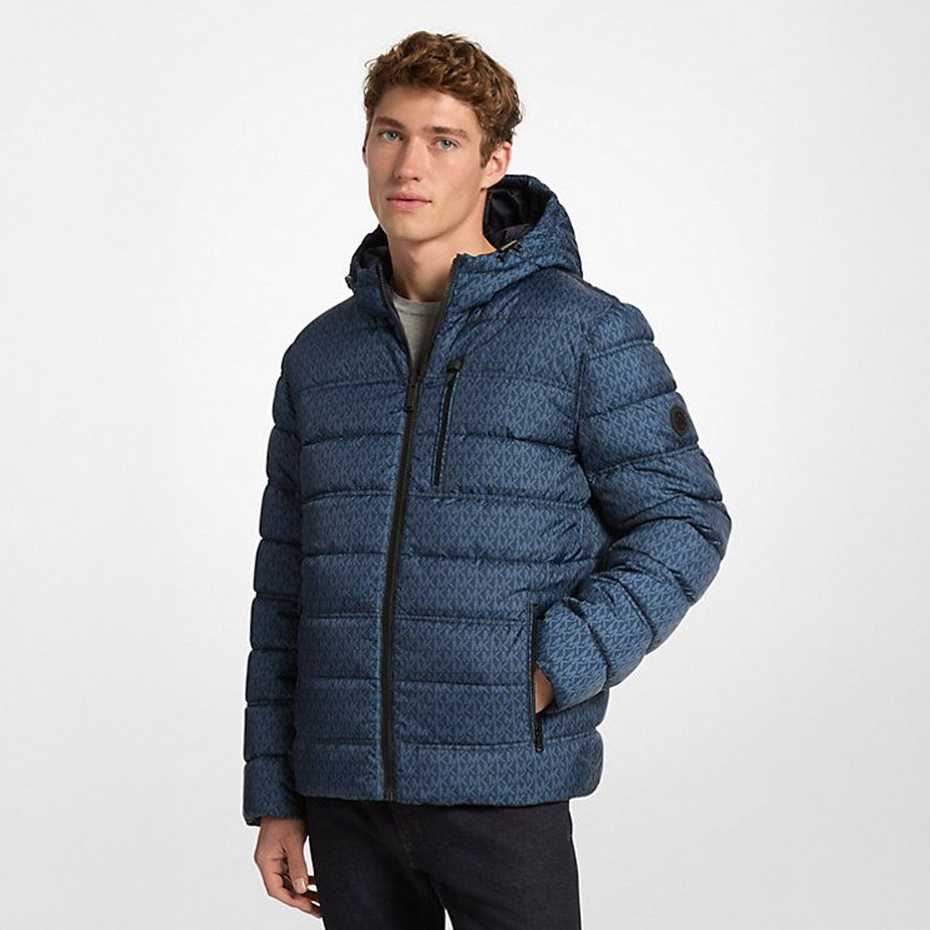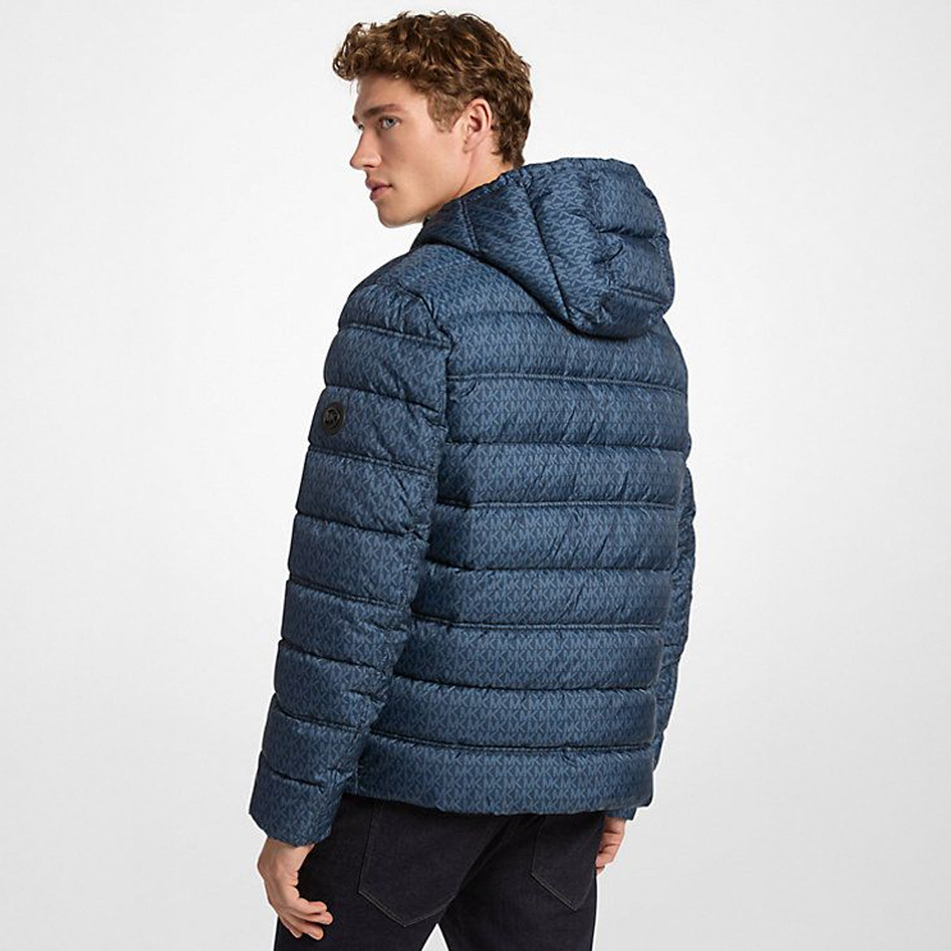 The durable, quilted fabric is covered in the subtle, all-over MK signature logo print in a rich blue/navy tone on one side, and midnight solid color on the reverse. It features a hood, a full zip closure, and practical side pockets. Whether you're commuting or heading out for the weekend, this puffer ensures you look sharp and feel comfortable.