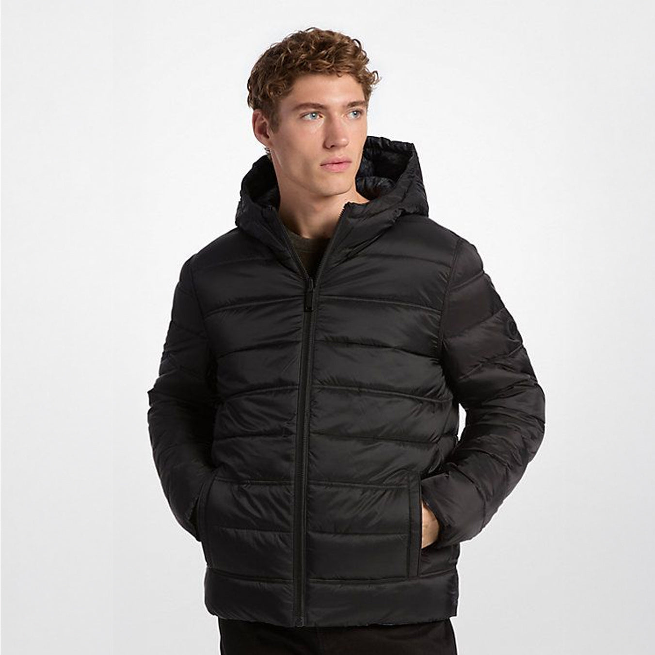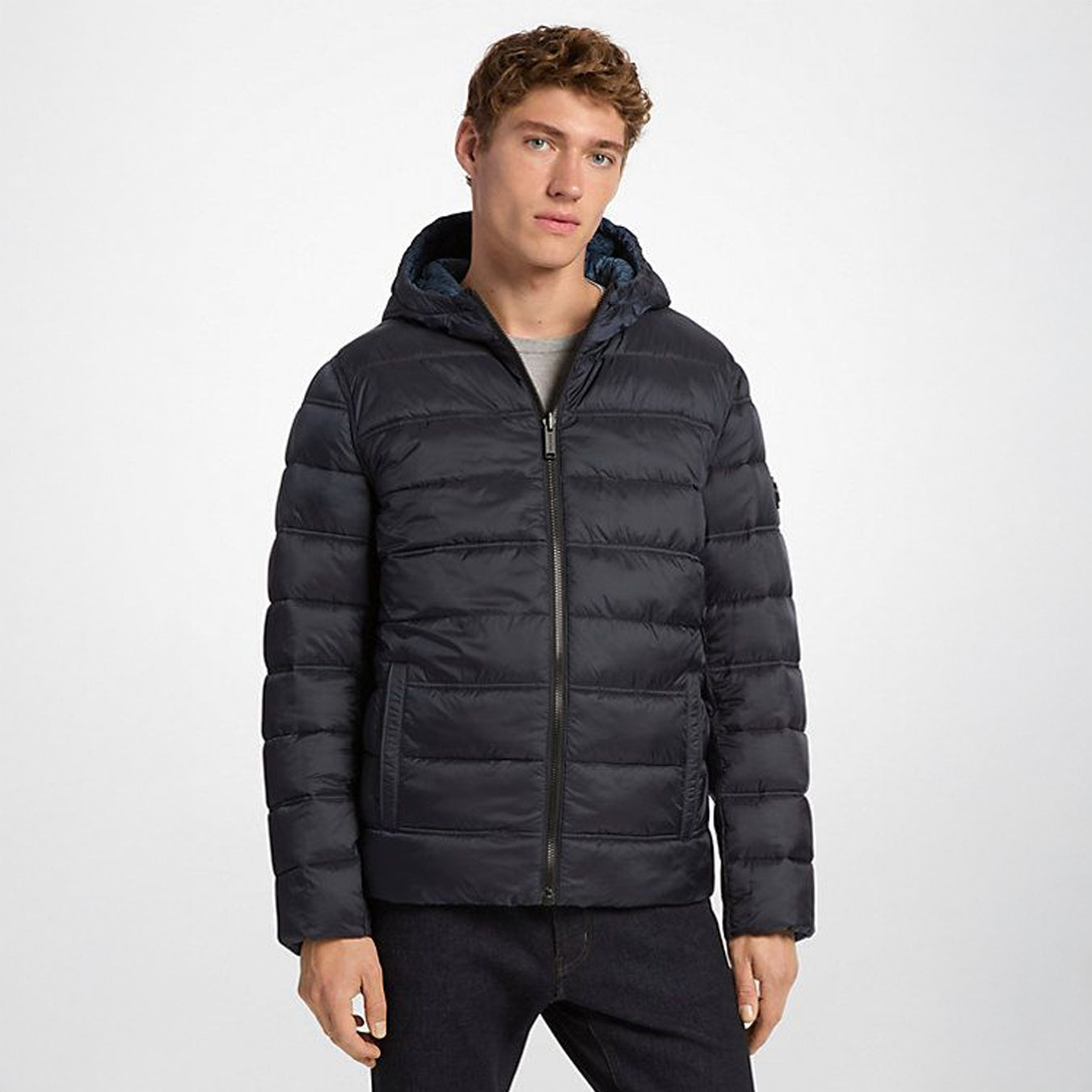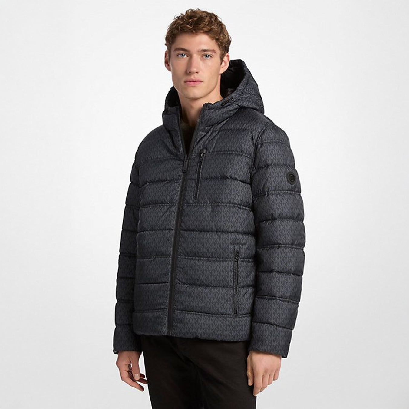 The durable, quilted fabric is covered in the subtle, all-over MK signature logo print in a rich blue/navy tone on one side, and midnight solid color on the reverse. It features a hood, a full zip closure, and practical side pockets. Whether you're commuting or heading out for the weekend, this puffer ensures you look sharp and feel comfortable.